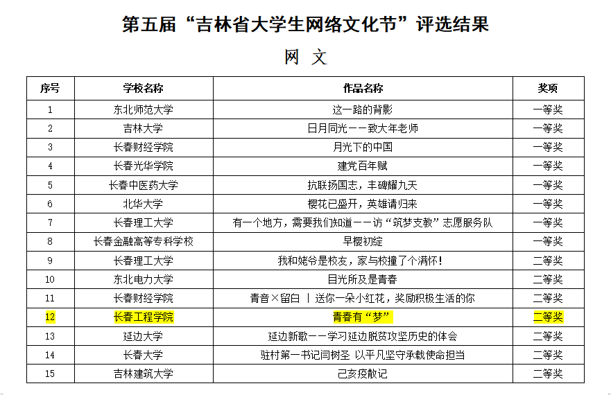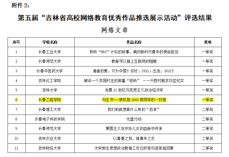 ⻢克思主义学院刘春玲老师的作品《与生书-致机制1843班同学的一封信》获高校网络教育优秀作品网络文章类一等奖;水利与环境工程学院给水1842班郭浩哲的作品《⻘春有“梦”》获吉林省大学生网络文化节网文类二等奖;计算机技术与工程学院软件1841班陈黔、计算1842班张家源、电商1932班刘天全、物联1841班雷镕旗的作品《绿洲》获吉林省大学生网络文化节校园歌曲类三等奖。
