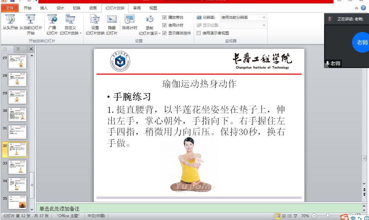 根据疫情情况,体育教研部科学调整课程内容和教学手段。依据现阶段环球网_环球(中国)的总体工作思路,在总结2020年春季学期线上开展体育教学经验的基础上,调整教学计划、改良教学方法。线上教学不具备正常的体育课需要的场地、器材条件,教师在教学中主要以加强交流与互动,运动量小、娱乐性强的多形式体育活动为主,即喜闻乐见,又通俗易懂。 活泼易学的体育活动调动了学生运动的积极性,也潜移默化的使他们树立了“终身体育”的理念。