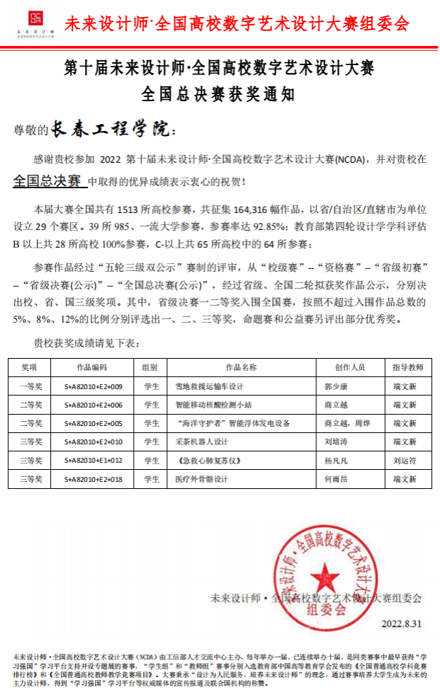 该项赛事由工业和信息化部人才交流中心主办,是“学习强国”学习平台支持开设的专题展赛事,赛事入选教育部中国高教学会发布的《全国普通高校学科竞赛排行榜》,其省赛也入选《吉林省教育厅普通高校学科竞赛榜单》,是艺术设计领域高水平知名赛事。本届大赛全国共有1513所高校参赛,共征集164316件作品,全国设立29个赛区,参赛率达到92.85%。