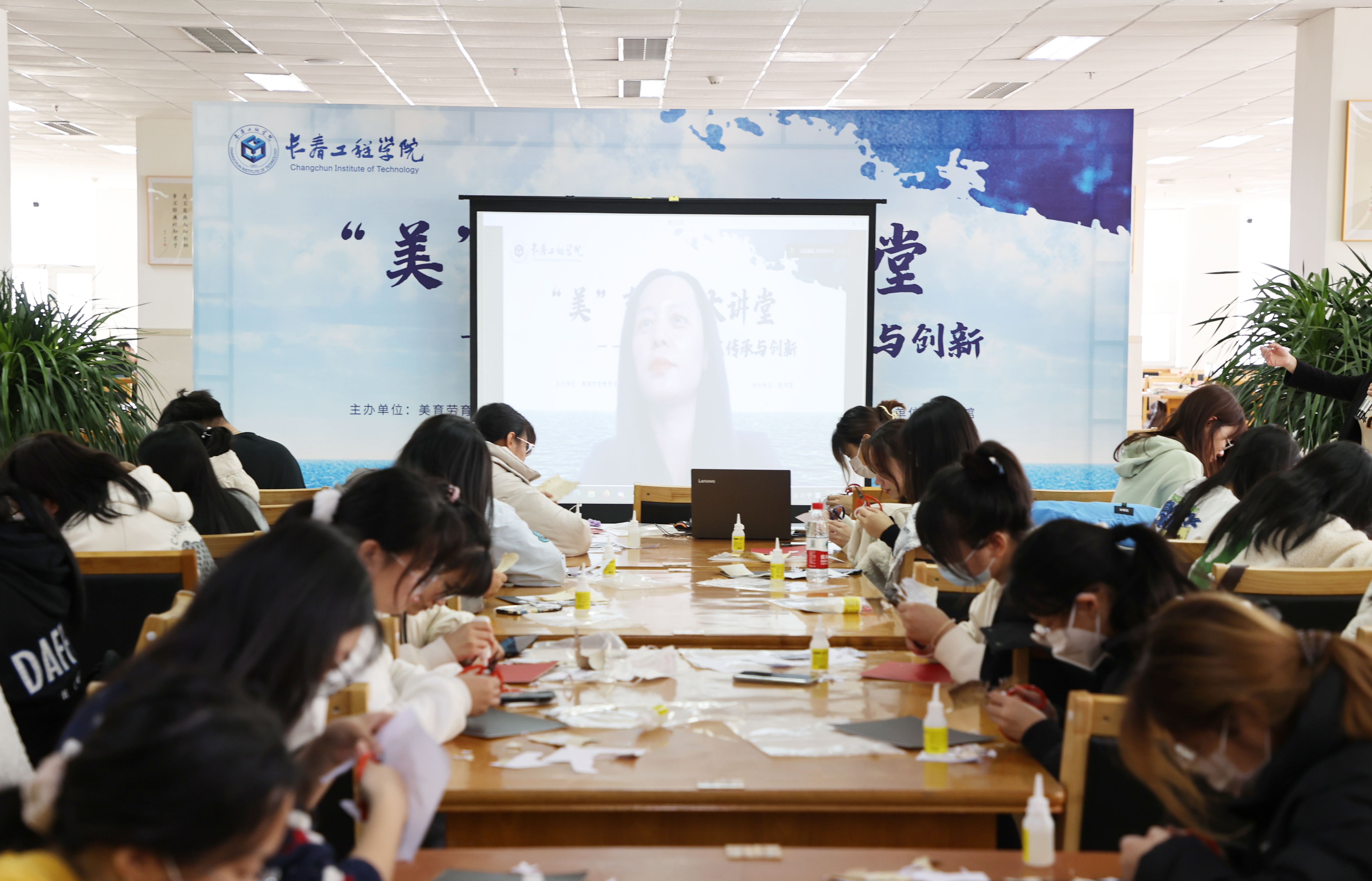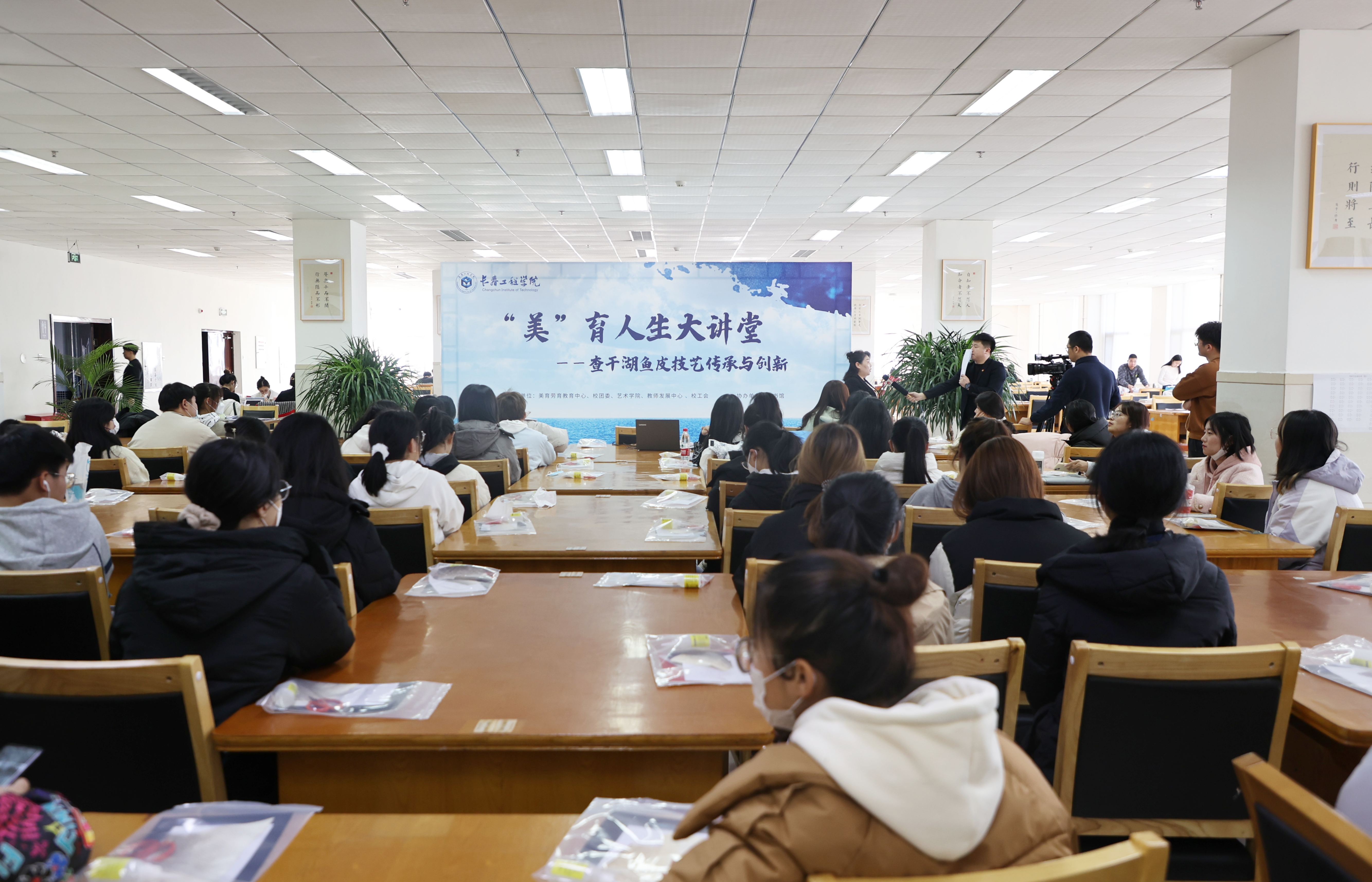 本次活动邀请了吉林省非遗项目查干湖鱼皮制作技艺传承人徐毳老师,围绕查干湖鱼皮制作技艺的传承与创新,和同学们分享她的创业经历,并通过现场教学,让学生亲自体验鱼皮工艺品的制作过程,了解鱼皮制作非遗项目。在丰富广大学生课余生活的同时,也加强学生对中华优秀传统艺术的热情,提升审美素养。