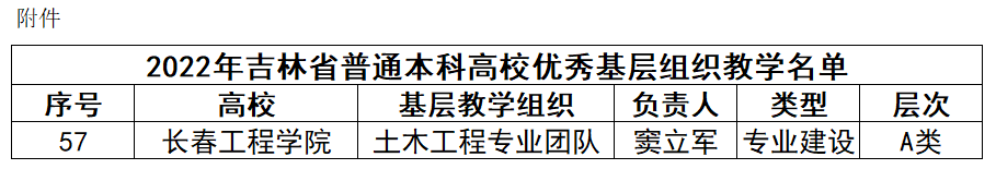 近日,吉林省教育厅发布了《吉林省教育厅关于公布2022年吉林省普通本科高校优秀基层教学组织名单的通知》(吉教高〔2022〕24号),我校土木工程专业团队成功获批2022年吉林省普通本科高校优秀基层教学组织(A类)。