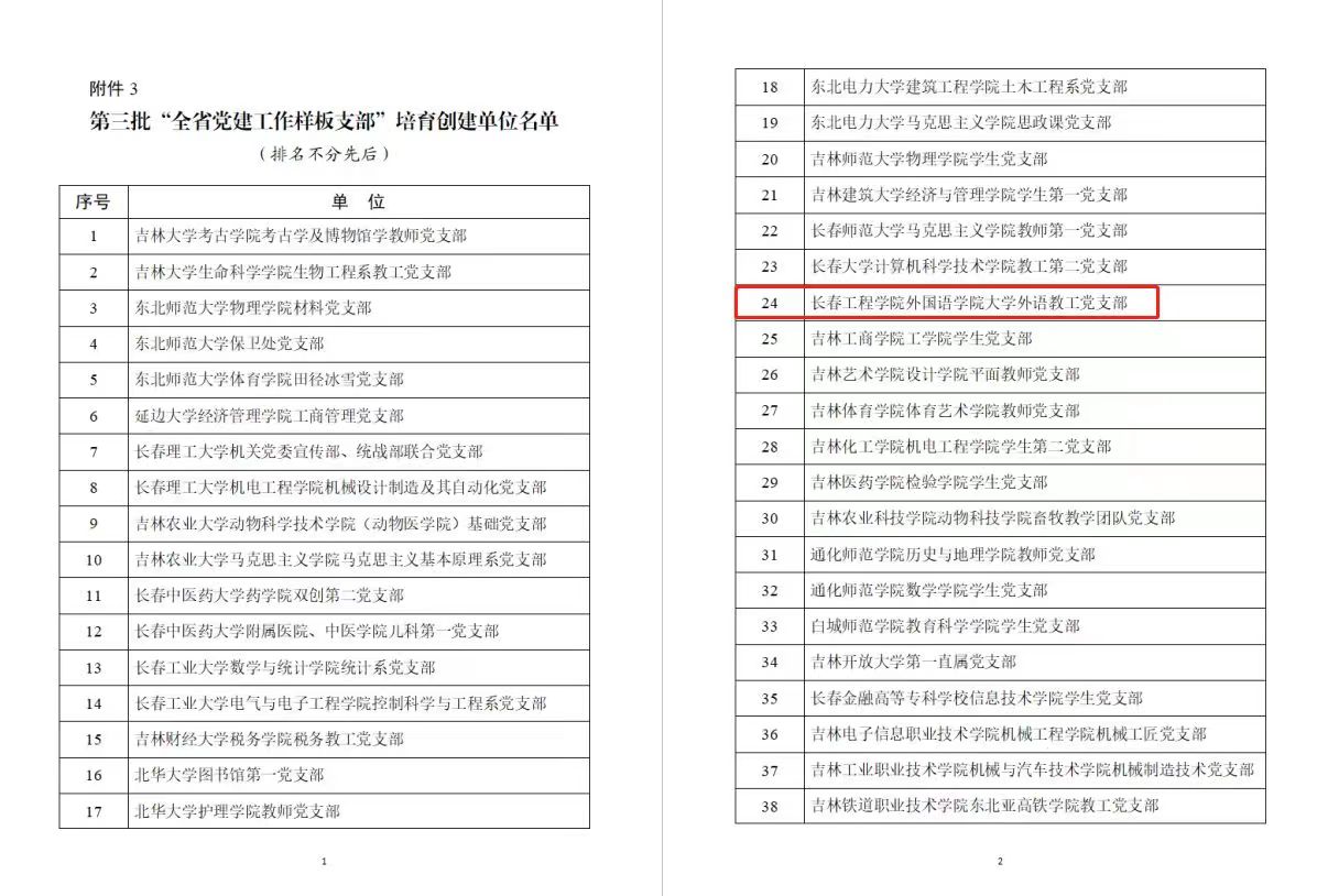 2月13日,中共吉林省委教育工作委员会公布了第三批新时代全省高校党建示范创建和质量创优工作评审结果,我校外国语学院大学外语教工党支部入选“第三批全省党建工作样板支部”培育创建单位。