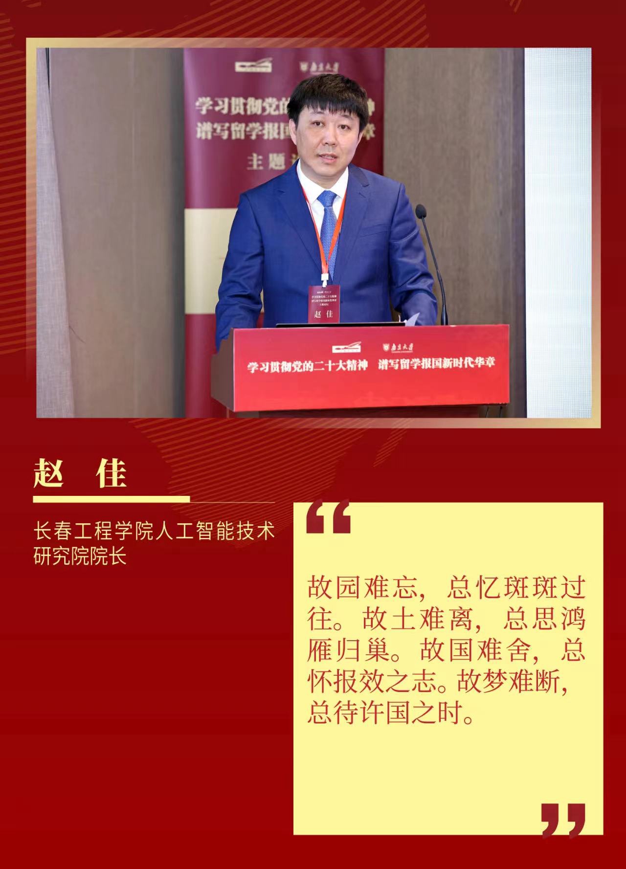 主题论坛结束后,在吉林省委统战部、吉林省欧美同学会(吉林省留学人员联谊会)主办的全省留学人员“智力支持吉林振兴 留学谱写报国华章”座谈会上,赵佳教授作了题为“遍育桃李哺芳华 一片丹心献故园”的主题报告。赵佳教授有决心把爱国的理想、爱乡的情怀、爱校的志向,统一到自己治学从教、立德树人的工作中。在环球网_环球(中国)党委的领导下,在统战旗帜的指引下,以百倍的热情铆足干劲,以万丈的豪情力争上游,为把我校建设成国内一流应用型大学,再续新篇,再创辉煌。