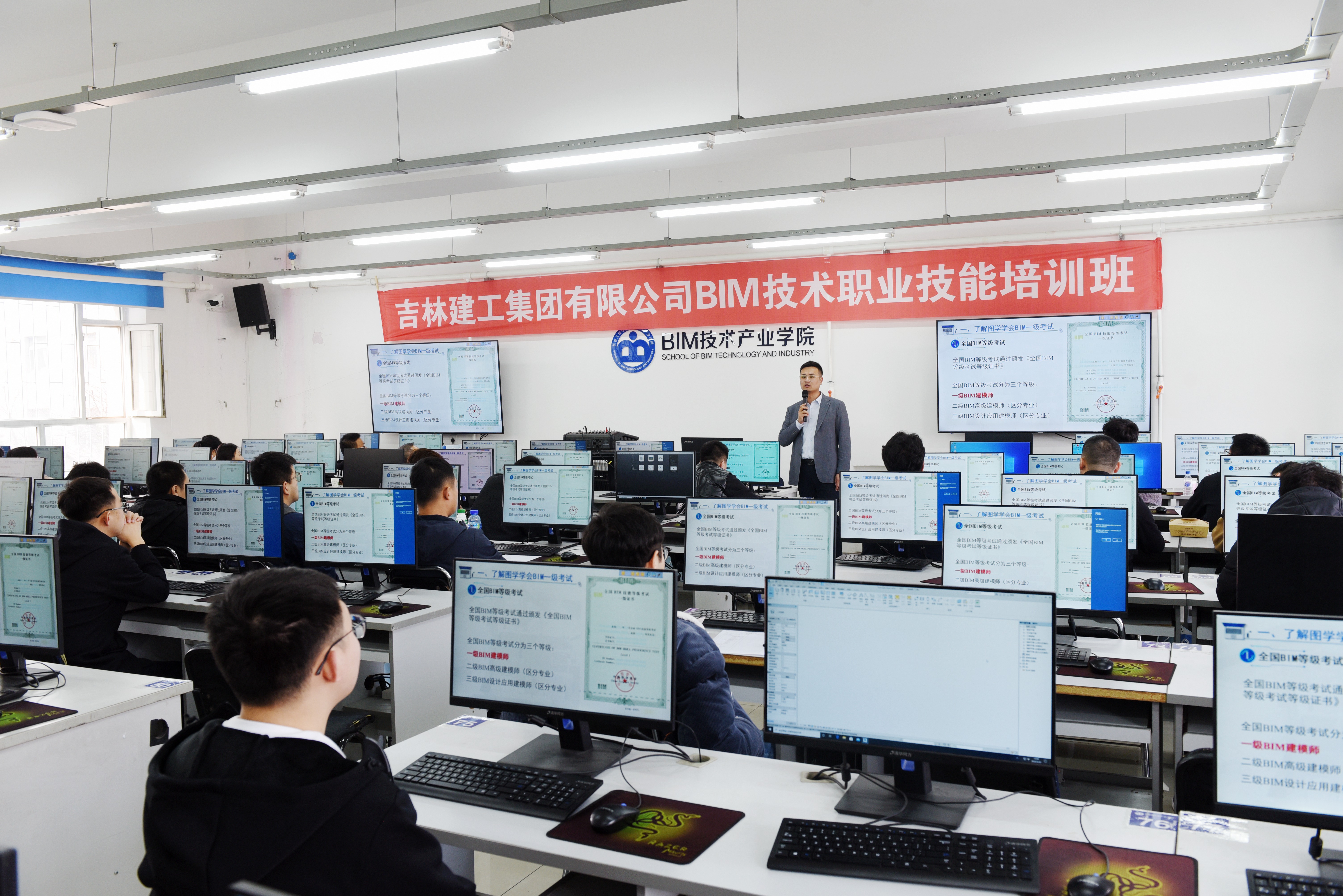 本次培训在BIM教育中心开展,采取了线下线上相结合的方式进行。BIM技术产业学院教师和研究生助教组成线下授课团队开展理论课与实操课,并为吉林建工集团所有员工提供免费线上视频课程。参培人员就数字建造理论、BIM建模基础、BIM机电安装等内容接受了具体培训。本次培训帮助学员夯实了数字建造基本理论知识,提升了BIM软件操作能力。
