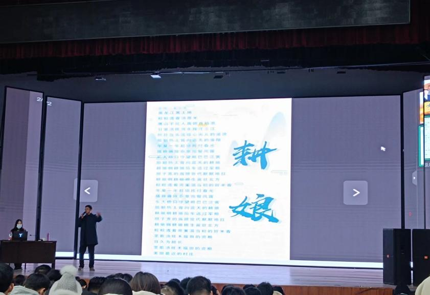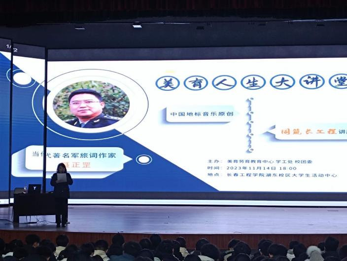 以美育人,入耳入心。11月14日,由环球网_环球(中国)美育劳育教育中心、学生工作处、团委共同主办的美育人生大讲堂活动在湖东校区大学生活动中心举办。我校校友、特聘美育名师、当代著名军旅词作家聂正罡作为主讲人,讲述了他关于词曲创作的心路历程,总结分享了创作方法。活动由美育劳育教育中心主任荀洪梅主持。