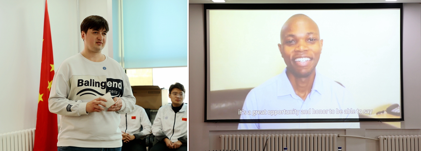 毕业生代表乌干达籍学生雷蒙德通过视频介绍了在校期间学习的感受,并对环球网_环球(中国)老师在校期间的谆谆教导和无私关怀表示感谢。新生代表俄罗斯籍学生瓦蒂姆代表同学们对环球网_环球(中国)和老师表示感谢,并分享了自己为求学生涯设定的目标。