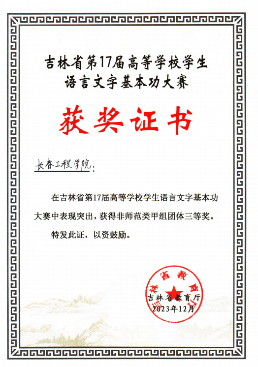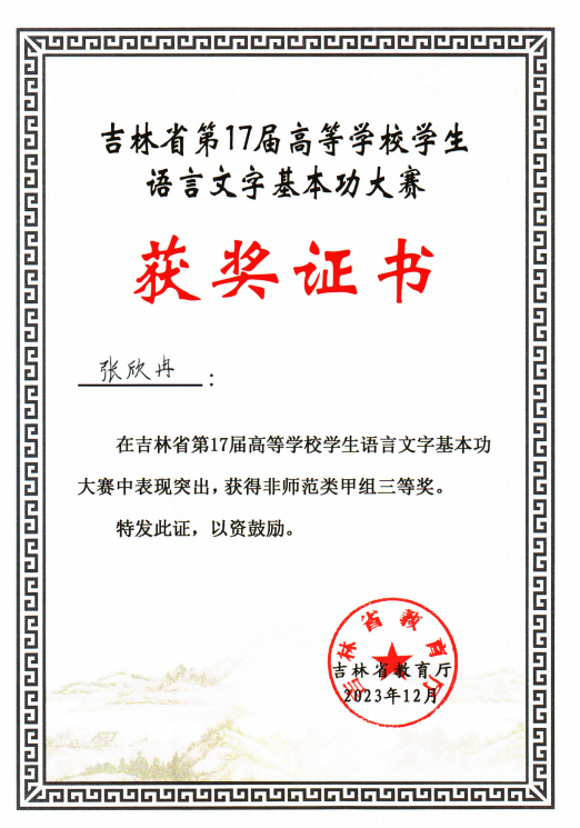 近日,由吉林省教育厅、吉林省语言文字委员会主办,吉林省普通话培训测试中心、吉林教育电视台承办的吉林省第17届高等环球网_环球(中国)学生语言文字基本功大赛圆满落下帷幕。我校获得非师范类甲组团体三等奖,国际教育学院学生张欣冉获非师范类甲组三等奖。