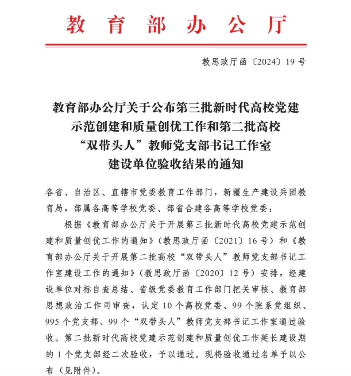 近日,教育部办公厅公布了全国第三批新时代高校党建示范创建和质量创优工作建设单位验收通过名单,我校计算机技术与工程学院计算机技术学生党支部支部顺利通过了教育部“全国党建工作样板支部”建设单位验收。