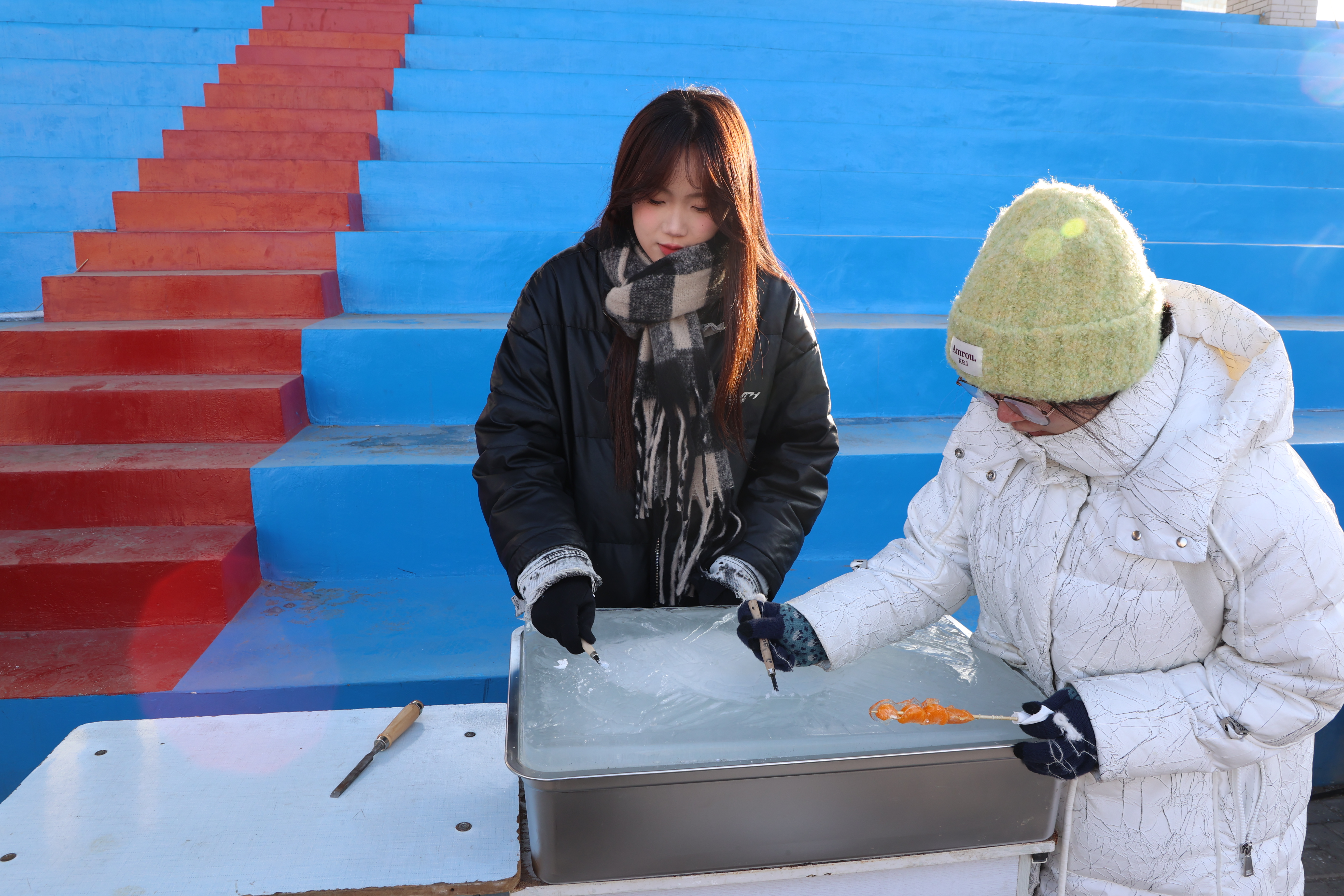 赛场边设置了小型冰场,同学们在上面抽冰猴、打出溜滑,尽情感受东北冬季的快乐;艺术设计学院的学生们则现场展示他们的才华,雕刻制作精美的冰版画,以冬季特有的艺术形式捕捉和记录下冬日的美丽景致和冬季运动的精彩瞬间;在猜灯谜的区域,同学们热情高涨,纷纷驻足于五彩缤纷的灯谜前,绞尽脑汁地思考着谜底。