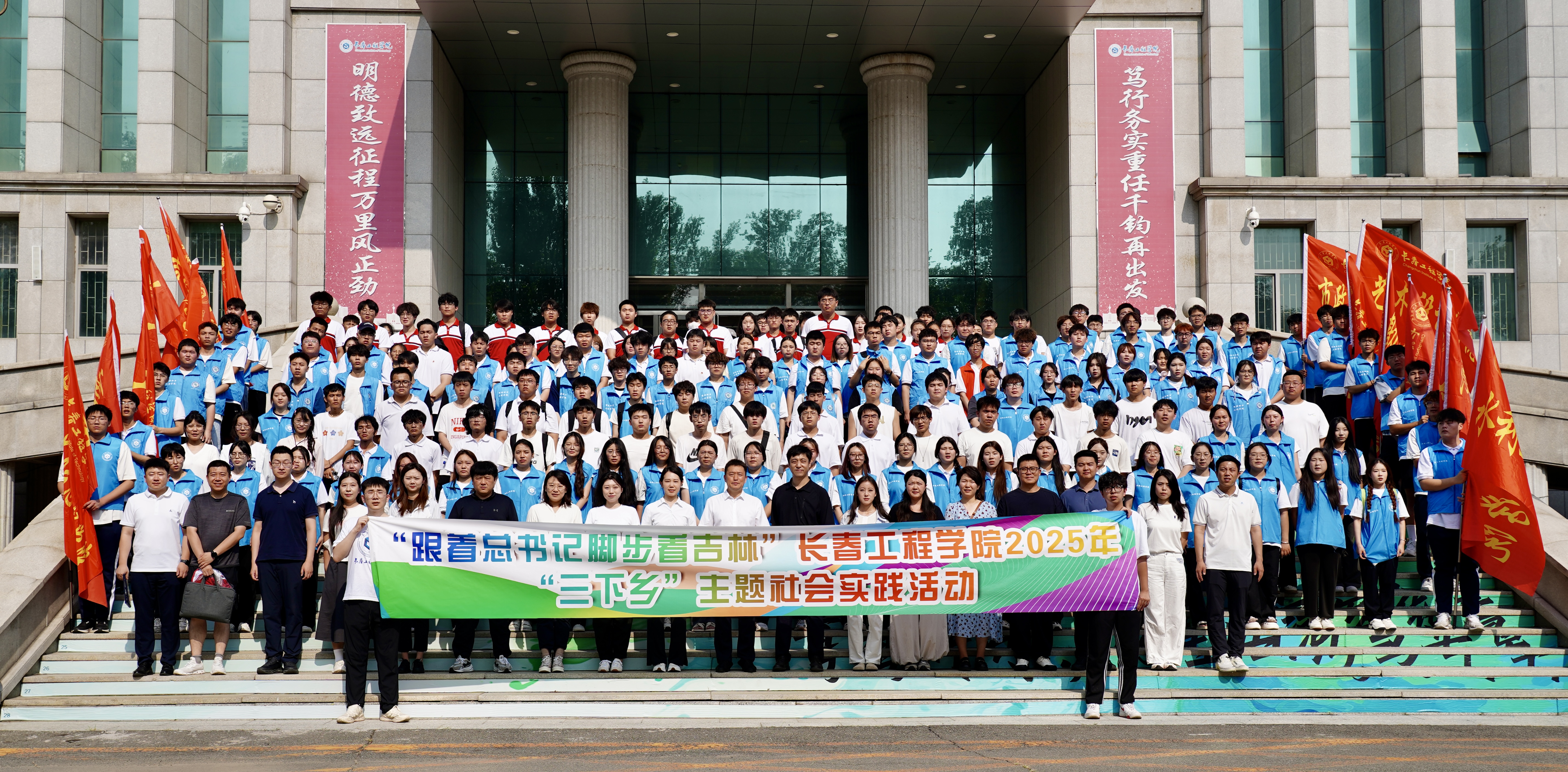 张邦成副校长为出征队伍授旗并在讲话中指出,大学生“三下乡”是上好与现实结合的“大思政课”、在吉林沃土践行青年担当的宝贵契机,沿着总书记足迹,用心感受、用情探索、用力建设“五色吉林”。同学们要躬身基层实践,淬炼过硬本领,自主地去探索、去领悟、去学习,促进自身的全面发展。带队老师要强化安全意识、压实安全责任,自觉树立良好形象,杜绝一切安全隐患。