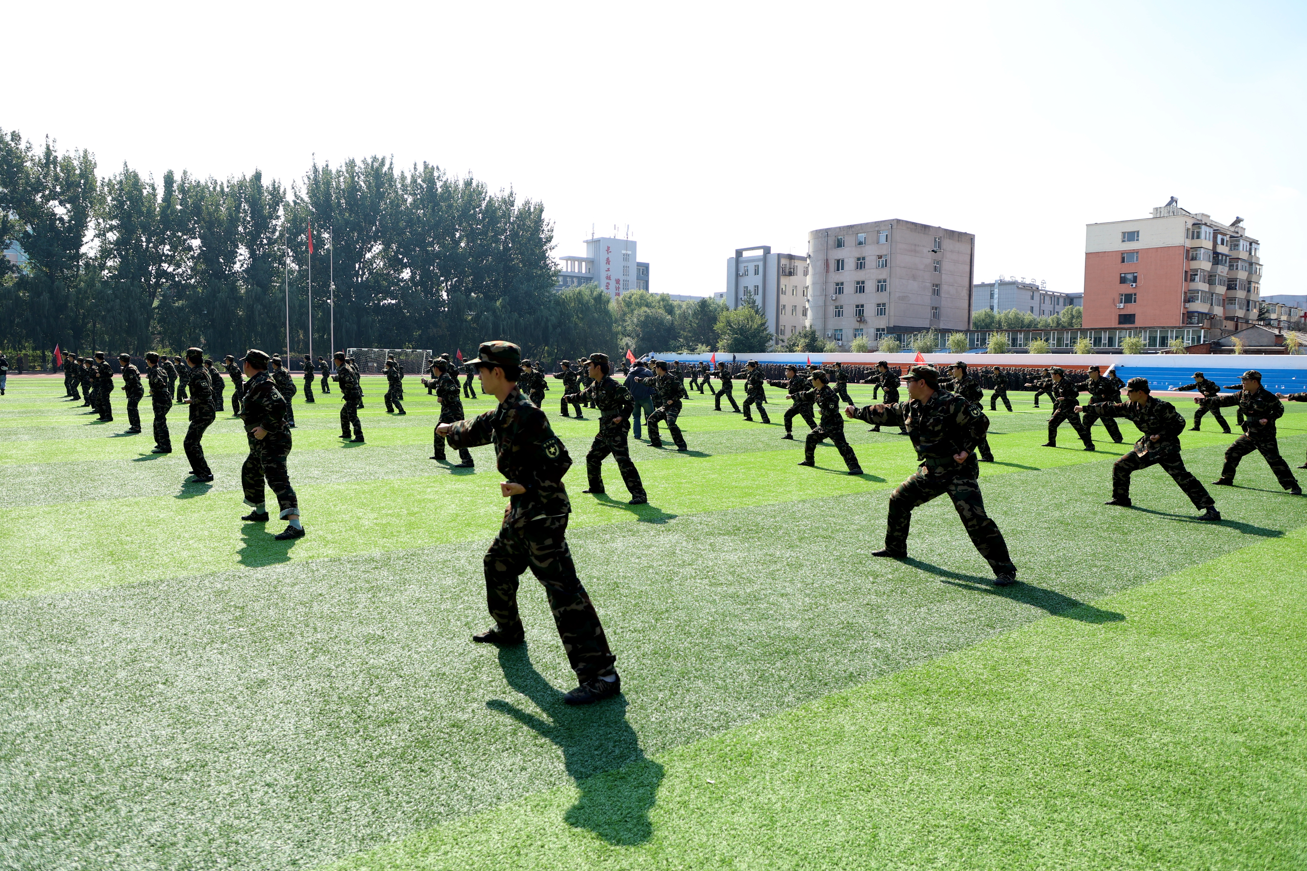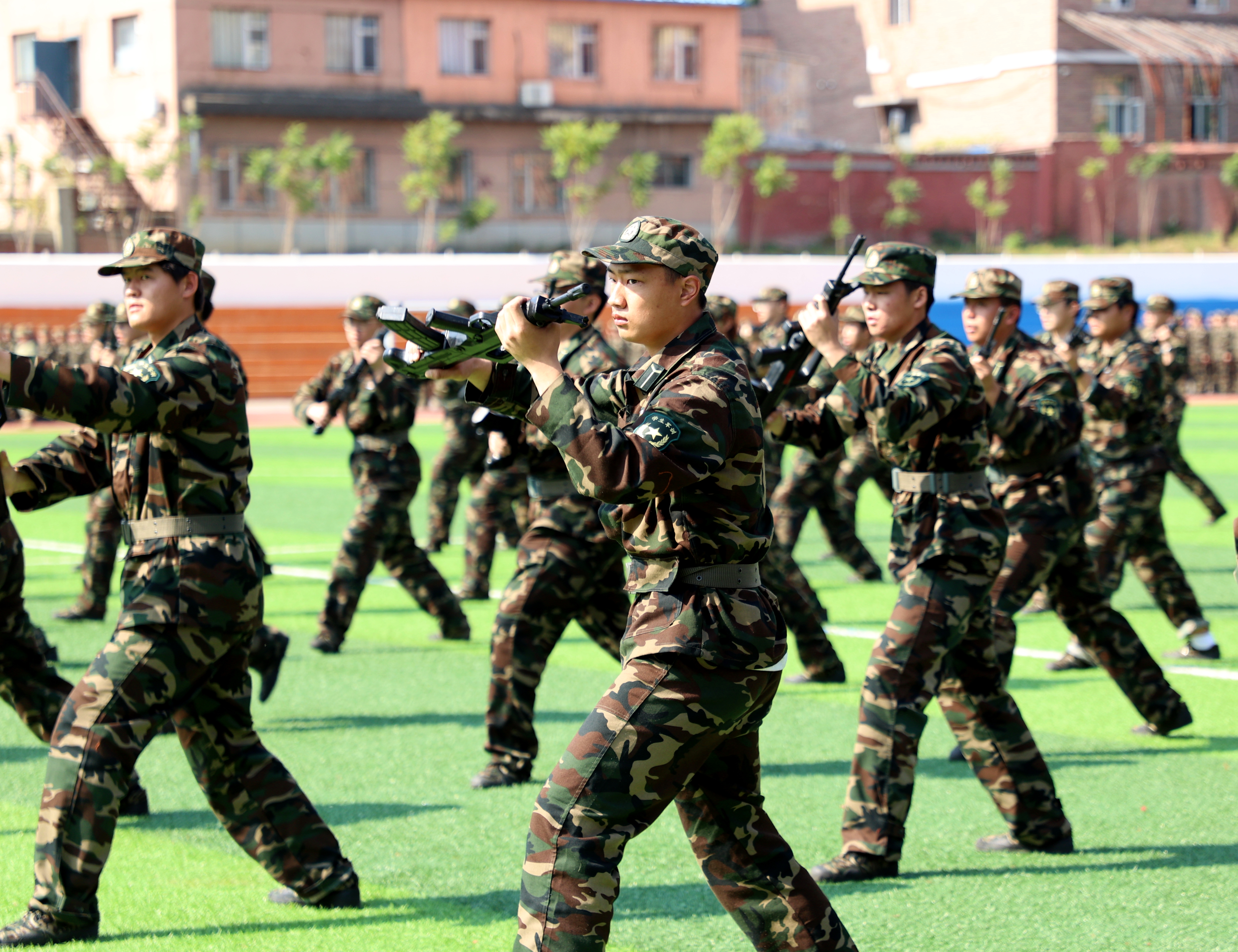 仪式在庄严的国歌声中拉开帷幕。军事技能汇报表演、军体拳、刺杀操虎虎生威,动作刚劲有力,尽显阳刚之气。