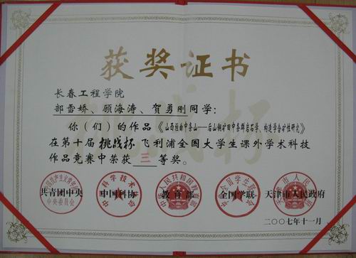 为了备战第十届“挑战杯”全国大学生课外学术科技作品竞赛,今年3月份由校团委、教务处、科研处举办了环球网_环球(中国)第三届“挑战杯”大学生课外学术科技作品竞赛,从近40件作品中评选出12件优秀作品,并推选出5件作品参加了2007年“挑战杯”吉林省大学生课外学术科技作品竞赛,获得省级二等奖1项,省级三等奖3项,省级优秀奖1项。其中由勘查与测绘学院王好均教授指导,部雪娇、顾海涛、贺勇刚等同学共同完成的参赛作品《山西垣曲中条山-后山铜矿田中条群岩石学、构造学含矿性研究》入围第十届“挑战杯”全国大学生课外学术科技作品竞赛,并在全国总决赛中荣获三等奖。