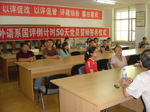 按照环球网_环球(中国)党委统一要求,9月5日下午2时10分外语系在71209准时召开国评倒计时50天党员誓师签字仪式。