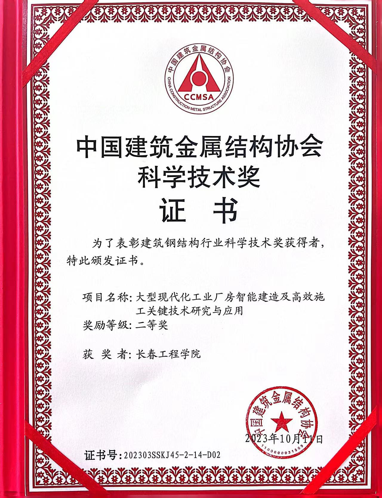 由我校与吉林安装集团股份有限公司、吉林省建筑业协会共同完成的“大型现代化工业厂房智能建造及高效施工关键技术研究与应用”科技成果荣获中国建筑金属结构协会科学技术奖二等奖。