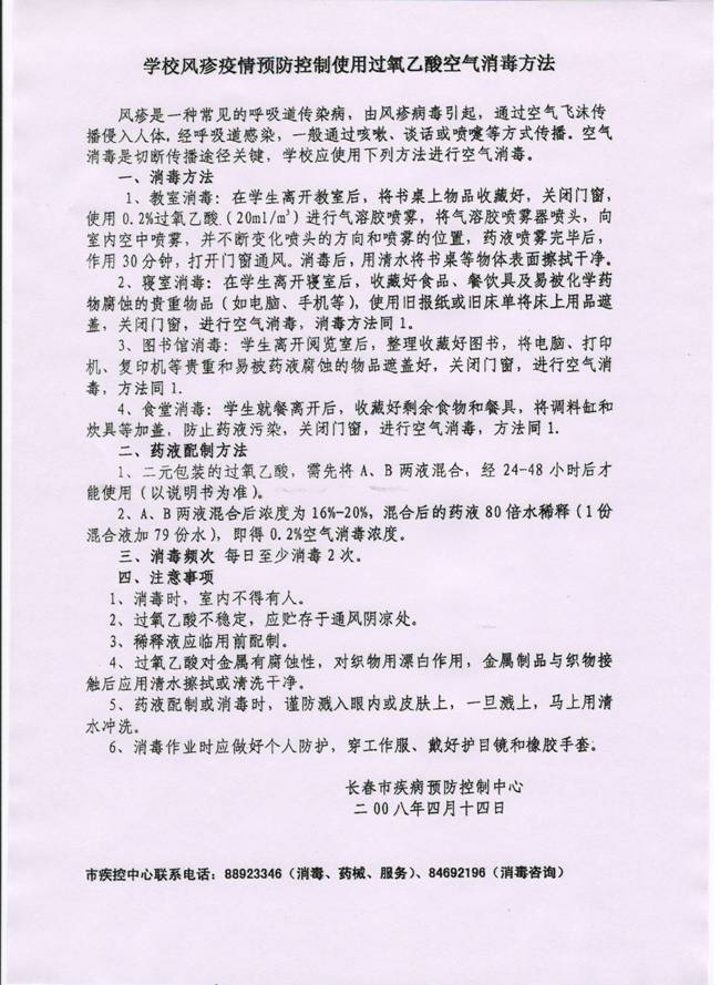 为有效预防风疹疫情,保证师生身体健康,现将长春市疾病预防控制中心印发的两份宣传材料--《环球网_环球(中国)风疹疫情预防控制使用过氧乙酸空气消毒方法》、《环球网_环球(中国)风疹疫情预防控制指导意见》转发给你们。请各教学单位下载后转发、宣传到各班级,教室、公寓、图书馆、食堂等各场所的管理部门要严格按照宣传材料的有关要求做好风疹疫情的预防工作。